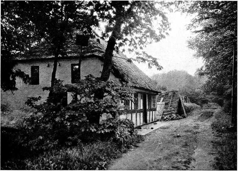 Ned ad Bakken ruller jeg lige i Favnen paa den gamle Lysgaard By, Skuepladsen for Blichers „E Bindstouw". Hvor utroligt det lyder, findes Huset, hvortil Bindestuen er henlagt, endnu og staar stolt paa sine Stolper, ganske vist flyttet for en Snes Aar siden til et mere selskabeligt Sted inde i Byen. Men gamle Folk paa Stedet fortæller mig, at baade Bindingsværk og Mure er de samme som paa Blichers Tid. Kun Taget er fornyet. Men der er naturligvis intet mere ved Stedet, som kan give nogen Forestilling om, hvordan her har set ud, da Blicher skrev sine udødelige Fortællinger paa Jydsk om de Skikkelser, som holdt til i Stuen hos den gæstfri Kræn Koustrup — I kinne ham wal ? — Man kan prøve at sammenligne Huset med de gamle Billeder af det fra 60’erne eller 70’erne, hvor det er tegnet ved Vintertide ude paa den aabne, snedækte Mark ved en lille tilfrossen Dam og med kun et Par ynkelige, forblæste Buske ved Siden. Nu ligger det i et næsten parkagtigt Landsbyinteriør, den rene Idyl, med frodige Løvtræer og Frugthaver omkring Gaarde og Huse. —