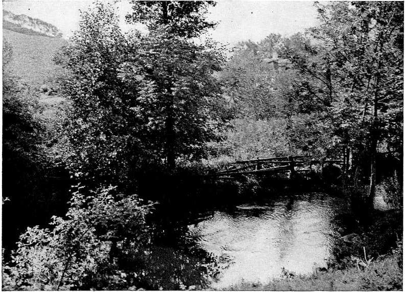 — Ved „Aastedet", hvor Vejen fra Aarup til Knoldehuse skærer Aaløbet nede paa Dalbunden, er et af de mest uberørte Steder i dette fra Naturens Haand romantiske Landskab, hvor Kløftens nøgne Skrænter staar som høje skærmende Mure paa begge Sider og værner den smalle Dalbund mod alle Vinde og tilsyneladende mod al Verdens Ondskab, mens Aaen vandrer gennem Lys og Skygge mellem Træerne i denne yndige Dal, hvor kun venlige Aander synes at have tilhuse — en Modsætning til de haarde Banker, som indrammer den.
