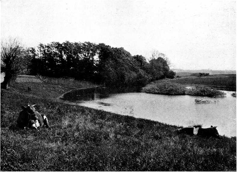 Men Egnen her er en af de mærkeligste i Danmark. Vi har mange Landskabsformer omkring de jydske Fjorde, men Randers Fjord er et Unicum imellem dem. Ved Uggelhuse og Grund Fjord naar det ejendommelige Landskab sin Kulmination. Intet andet Sted i Landet finder man dette Billede, og udenfor Danmark vistnok kun ét Sted — i Holland ved Ems’ eller Scheldens Udløb gennem Marsken. Stemningen i dette danske Landskab er ganske den samme som man møder i de hollandske Landskabsmaleres Kunst, de samme lave Enge om de vide Vanddrag, Landskabet hvor Ryggen af en Ko eller et lavt Hustag er det højeste Punkt, og med den vældige, høje Himmel med de tunge Klodeskyer derover — Vandmasserne gentaget paa Himlen i Skikkelse af Damp, Skyerne som det eneste synlige, der har Form..