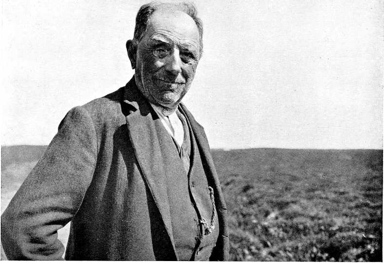 Der er ingen Tvivl om, at han straks ved, hvorfor jeg søger ham. Han tager det ganske naturligt, at jeg ved hvem han er, og vedkender sig det i Tavshed. Det er ikke første Gang, han er bleven opsøgt som Stammens sidste Ætling her paa Heden. Men han spørger naturligvis straks om, hvad jeg er for en Kaa’el og om mit Ærinde; det byder god Tone. Det er med et lille hurtigt Smil over det poliske Ansigt, han oplyser mig om, at han baade er bleven fotograferet og filmet herude. — „Det hiele bløw sendt te Kjøvvenhavn, aa det æ da derind’ indno!“ siger han. Han fortæller, at foruden Aakjær har Pastor Chr. H. Lidegaard fra Kragelund ved Silkeborg besøgt ham, og at den sidste har gjort en Mængde Optegnelser om ham, hans Slægt og dens Levnedsløb. — „Nowed aa’ed legger visnok hos Jepp,“ siger han. Han har endnu aldrig set noget af det paa Tryk; men det kan ogsaa være det samme. „For det A fortaall dem, det war jenne swot Løwn aalsammen!“