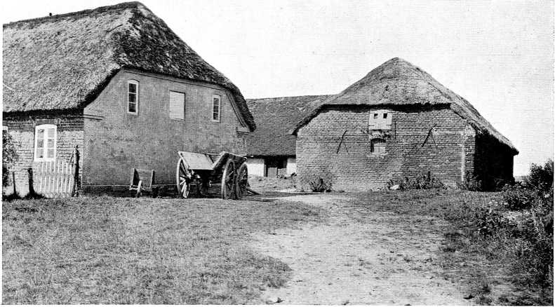 Kvæg græsser paa de lave, sumpede Marker, som er omgivet af rustne Pig-traadshegn. To Agerhøns løber foran os et Stykke henad Vejen, saa kommer et Par til inde fra en Havremark, hvorpaa de letter sammen og flyver ind over Kornet. Et Par Hundrede Meter fra Gaarden er to Pigtraadsspærringer tværs over Vejen tæt efter hinanden med et Par Led i; indenfor det første af disse staar her midt ude paa aaben Mark en lænket Ulvehund med et tømt Blikfad ved Siden.